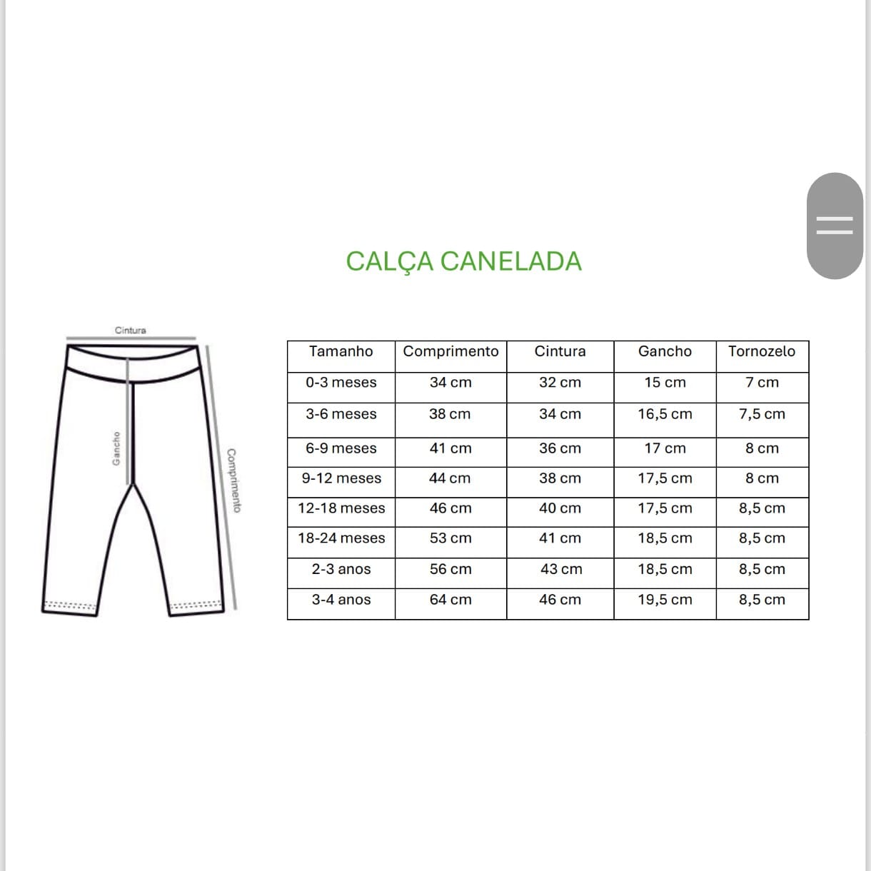 A calça canelada é um modelo básico, essencial para as crianças! Com formato slim, ela adiciona textura interessante aos looks. Feito de malha canelada 97% algodão e 3% de elastano, é prática para vestir crianças de qualquer idade, e carrega um estilo despojado e super confortável! É ótima para usar no dia a dia e para dormir. Possuí variações de tamanhos que vão de 0 a 4 anos. As cores são neutras, atemporais e combinam com as peças estampadas facilmente!